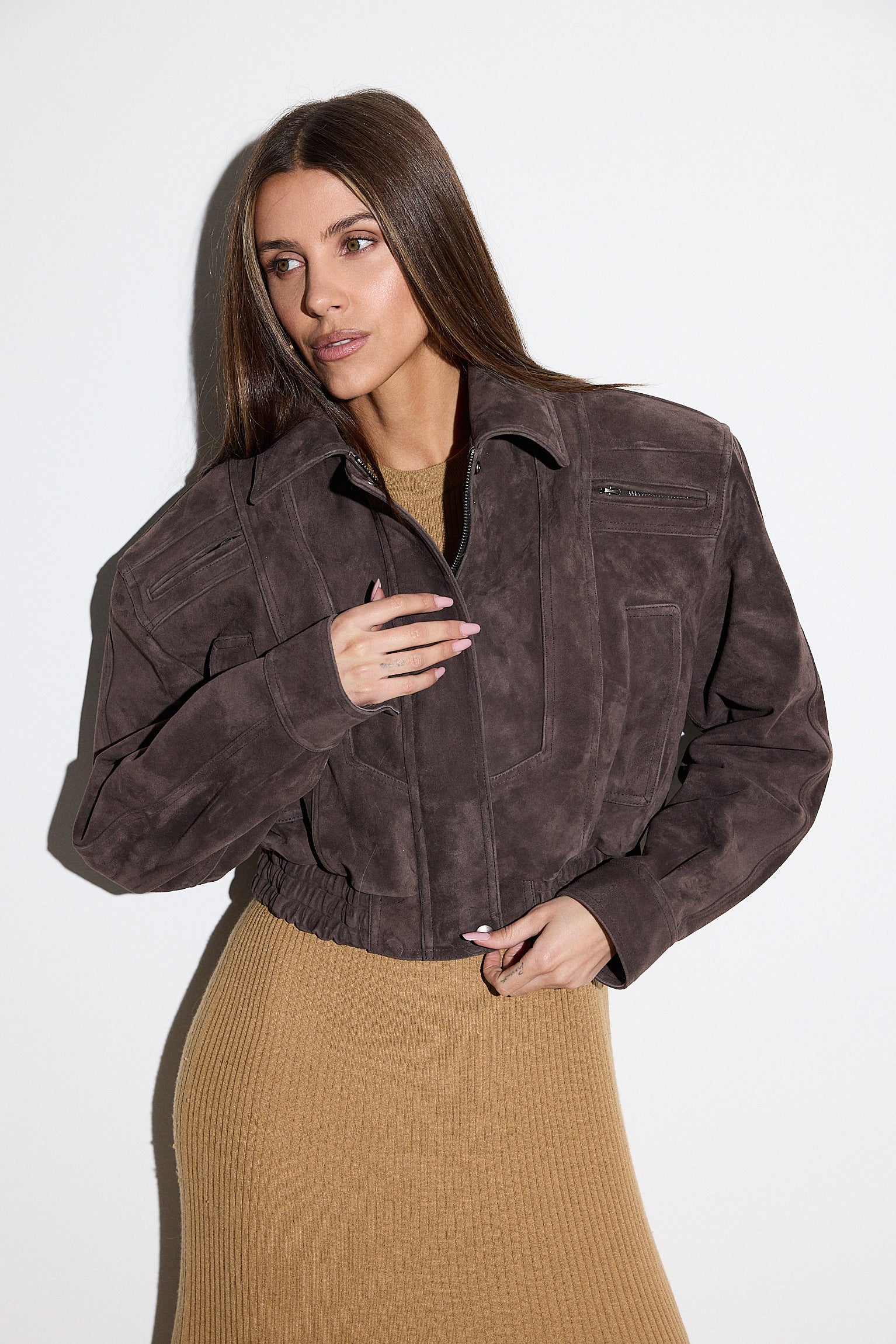 Feminin, entschlossen und raffiniert. Diese kurze Jacke aus schwarzem, genarbtem Leder ist der Inbegriff kraftvoller Eleganz. Das zweireihige Design mit Maxi-Revers und strukturierten Schulterdetails erinnert an den klassischen Trenchcoat, modern und sinnlich interpretiert. Die Taille wird durch den geknoteten Gürtel betont und sorgt für eine definierte, schlanke Silhouette.