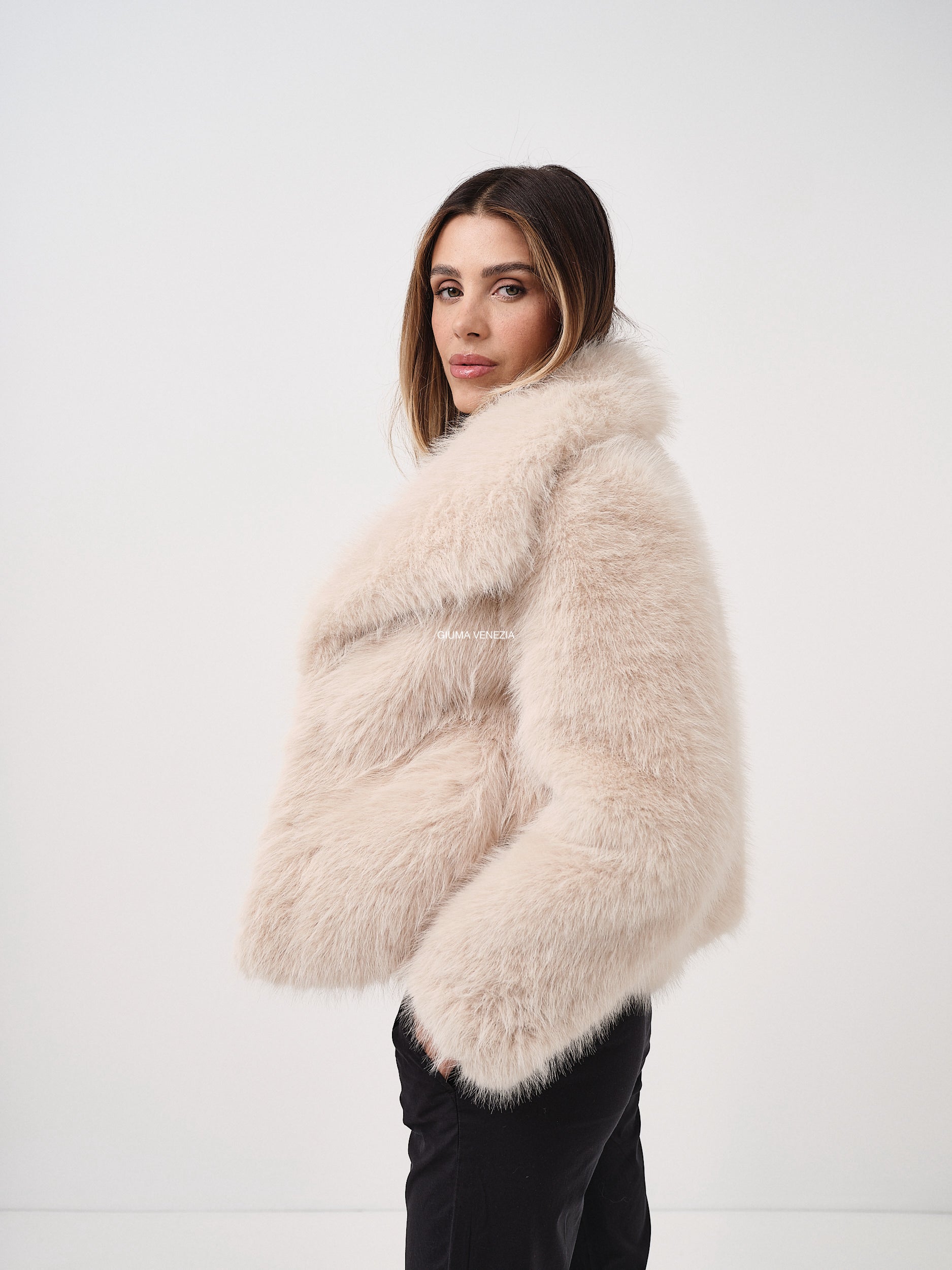 An iconic and trendy piece, it features a large notched collar and hook closure.