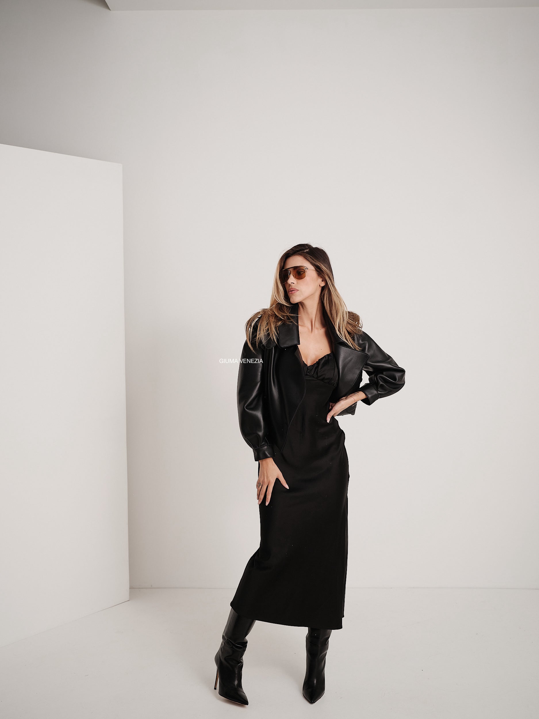 Short jacket with an oversized fit, made of soft leather. The model is characterized by biker-inspired details: low set-in sleeves with button at the bottom, lining, buckle closure.