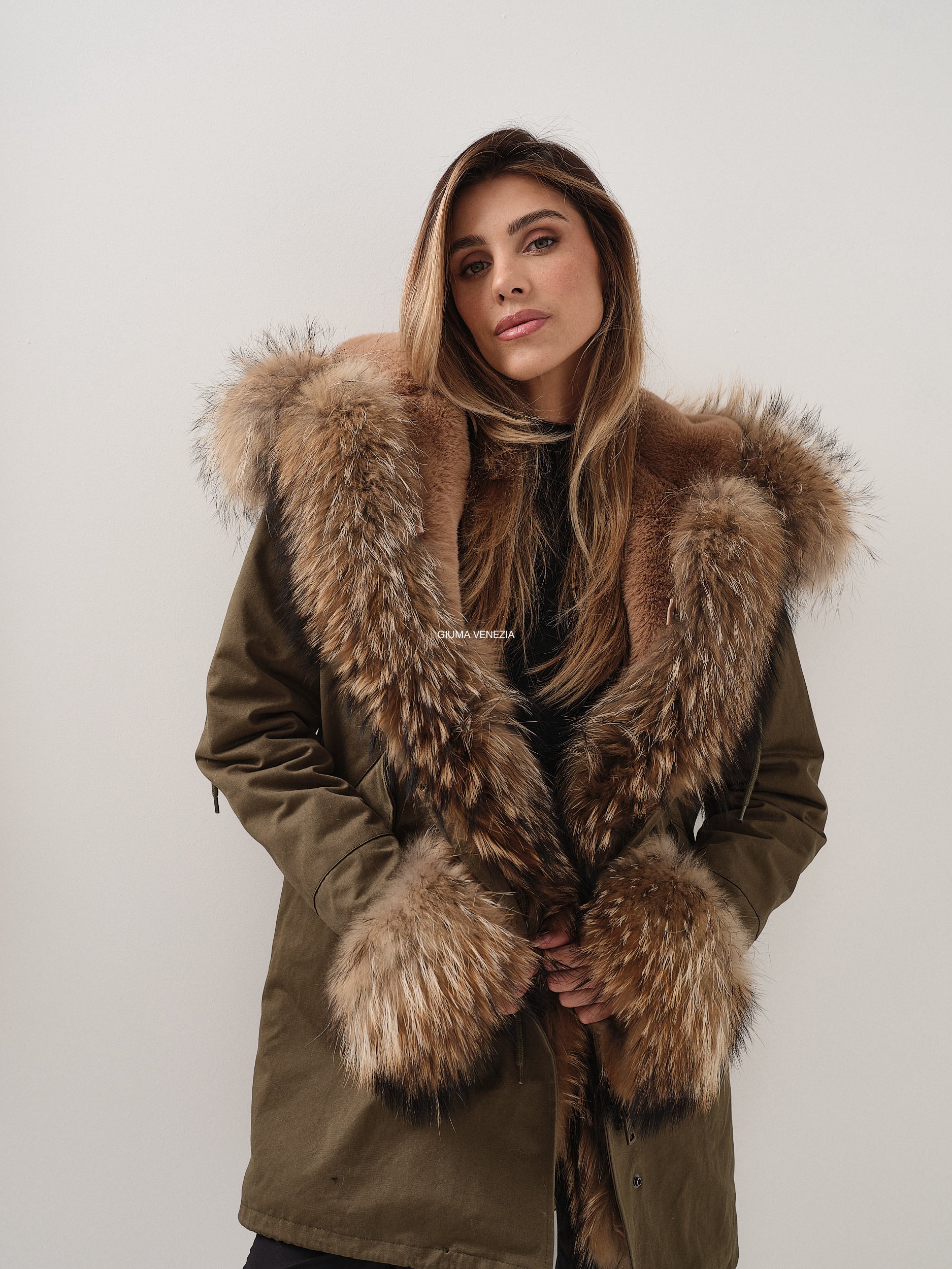 Technical waterproof cotton parka with real raccoon fur on collar, front, and cuffs, removable teddy lining inside. Zip closure.